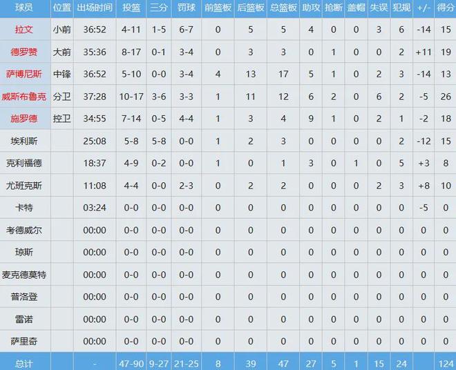 國王124-130不敵掘金,此役威少以首發大前鋒身份出戰,面對老東家打出本賽季最強一戰,約37分鐘時間里,投籃17中10,其中三分球6中3,罰球3中3砍下26分12板6助2斷炸裂數據。